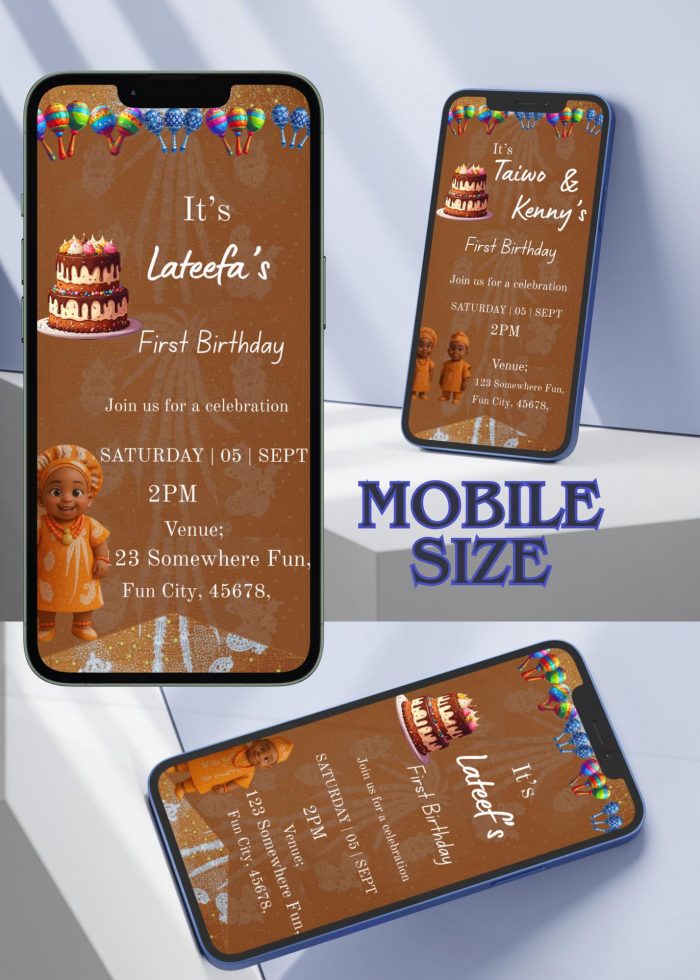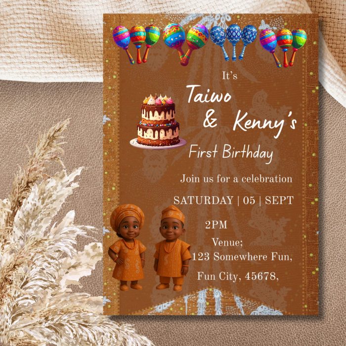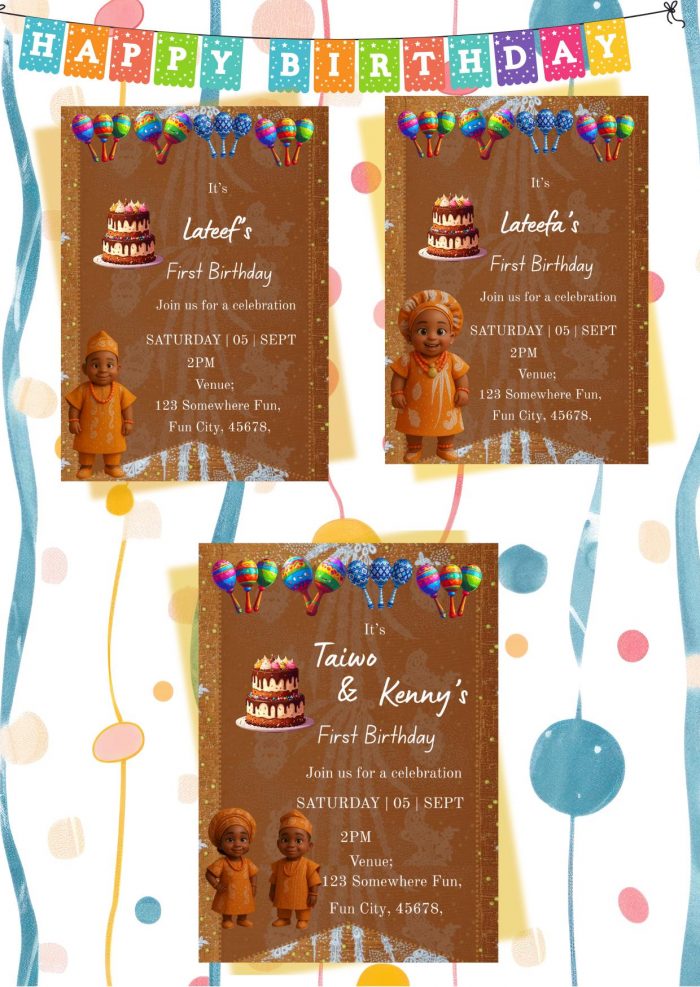 Celebrate your little one's special day with this beautiful and culturally-inspired Aso Oke themed invitation! This easy-to-use, editable template allows you to customize every detail for a unique and memorable announcement. Perfect for a first birthday party, this design features traditional Nigerian Aso Oke patterns and vibrant colors to set the tone for a festive celebration.