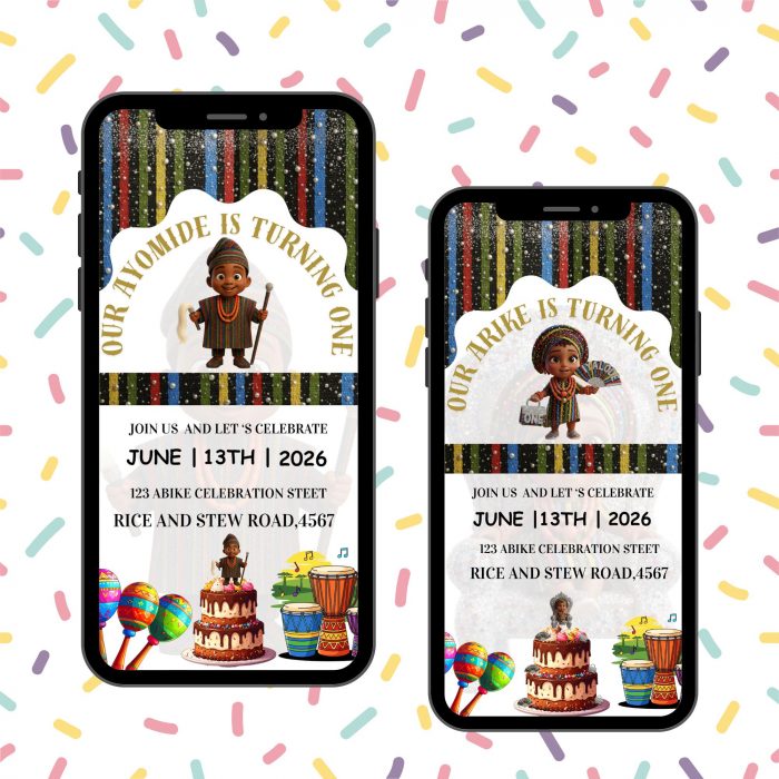 We call these theme, "IYALODE MULTI COLOUR & OBA MULTI COLOUR" .Celebrate your little one's special day with this beautiful and culturally-inspired Aso Oke themed invitation! This easy-to-use, editable template allows you to customize every detail for a unique and memorable announcement. Perfect for a first birthday party, this design features traditional Nigerian Aso Oke patterns and vibrant colors to set the tone for a festive celebration.