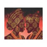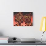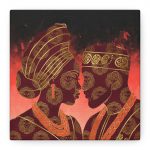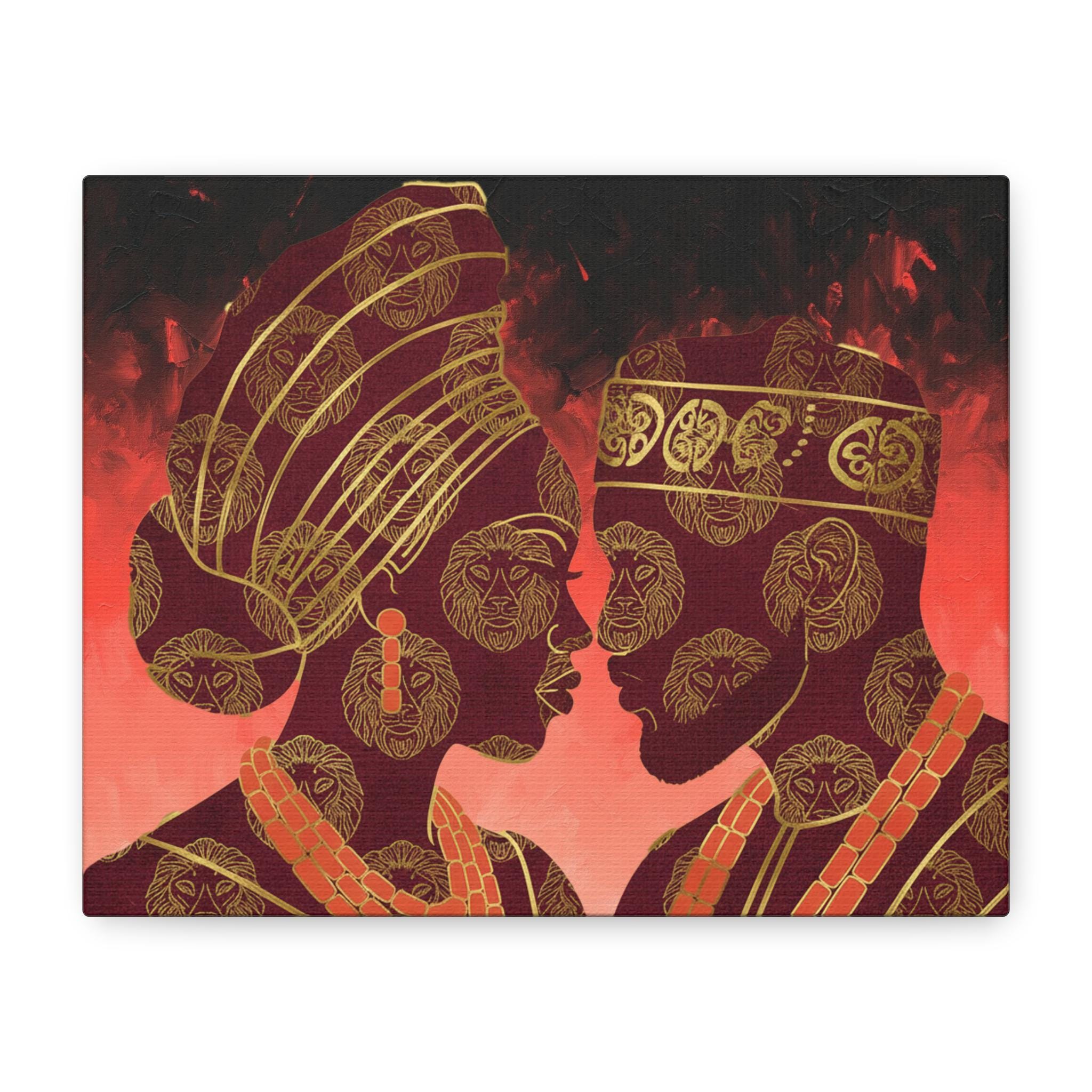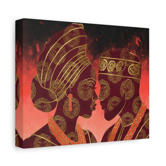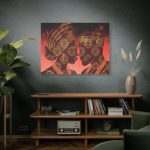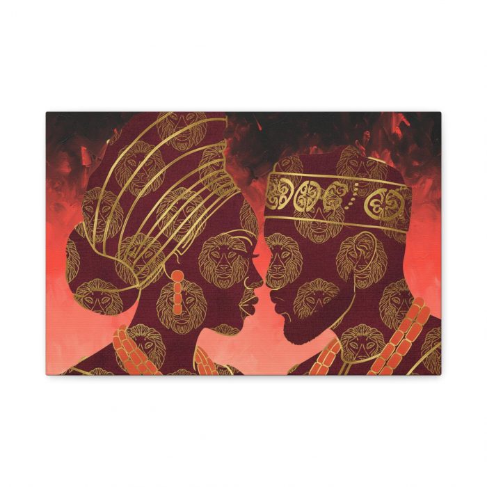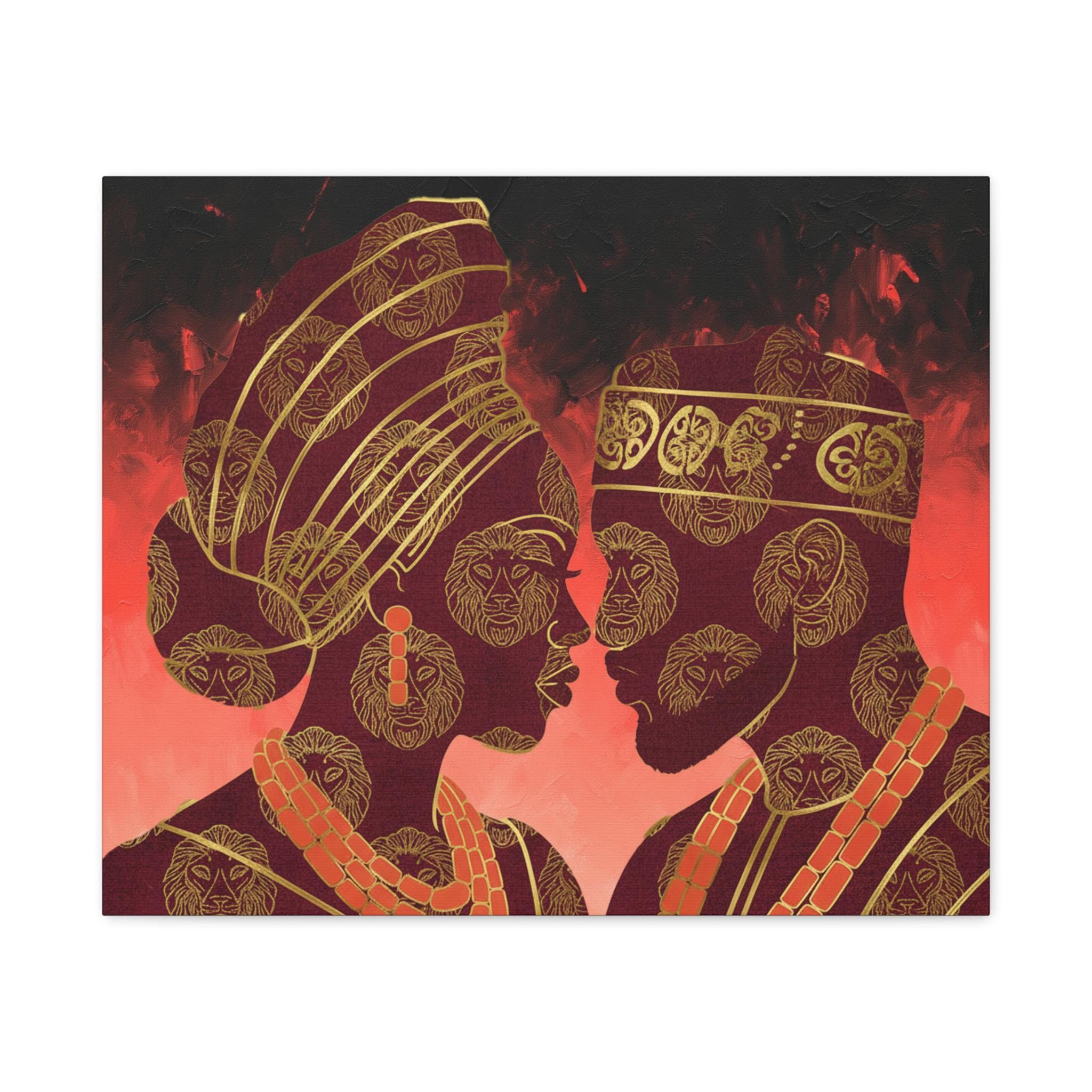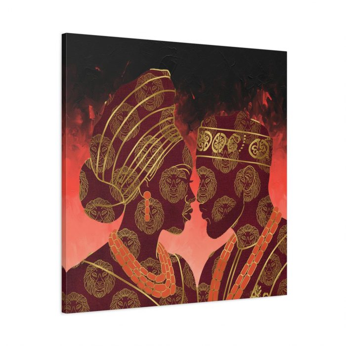 This canvas print features a couple silhouette painting made out of the traditional Isi Agu pattern, representing strength and leadership in Igbo culture. A unique silhouette of a couple in traditional Nigerian attire with coral wedding beads, set against a bold oil-paint effect background. This unexpected fusion of culture and modern artistry makes it a true statement piece. Perfect for those looking to showcase their Igbo identity and heritage at cultural events. Ideal for individuals celebrating African heritage, cultural events, and weddings.